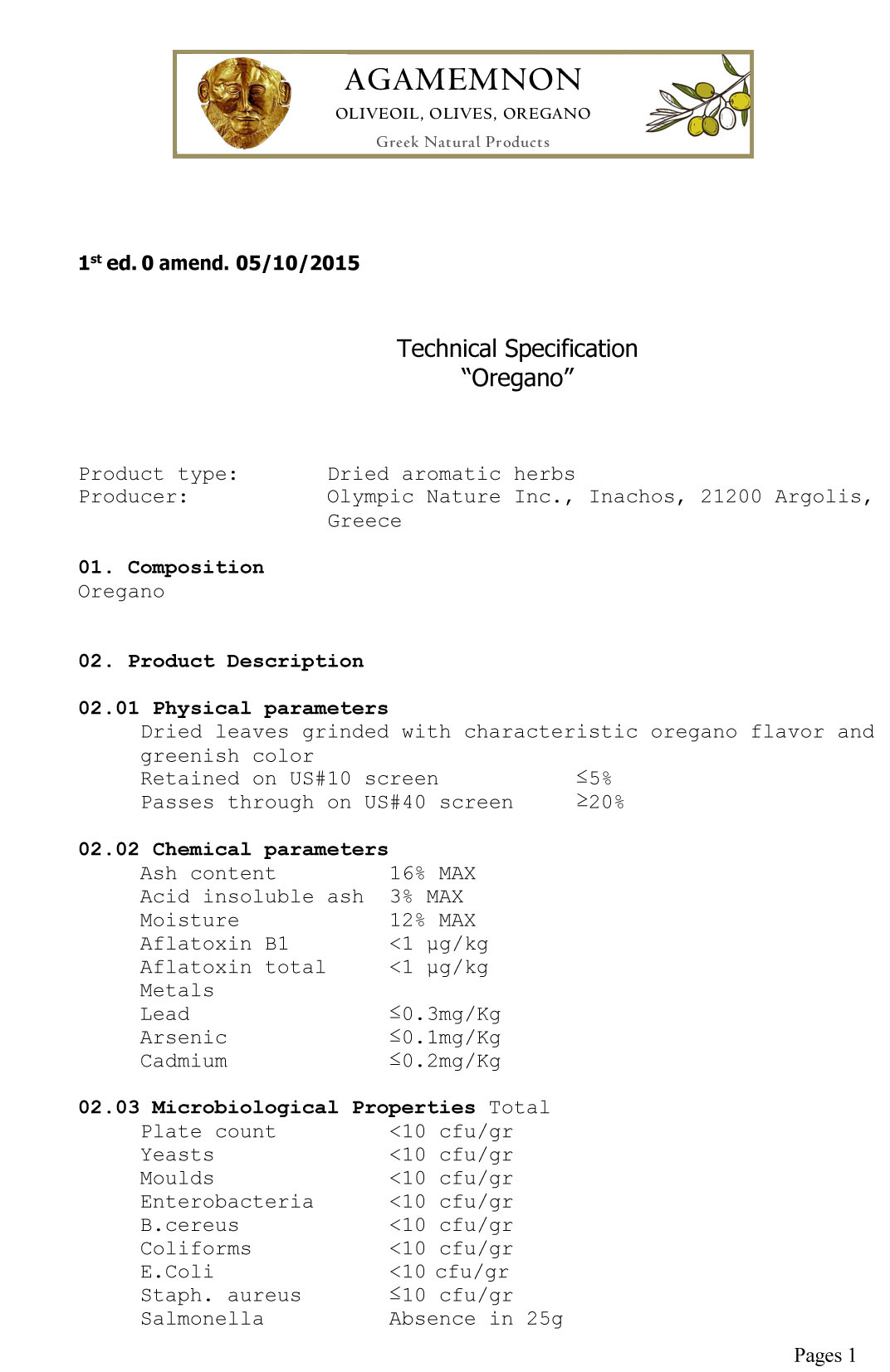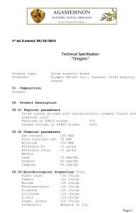 1. Physical parameters Dried leaves grinded with characteristic oregano flavor and greenish color Retained on US#10 screen ≤5% Passes through on US#40 screen ≥20%
