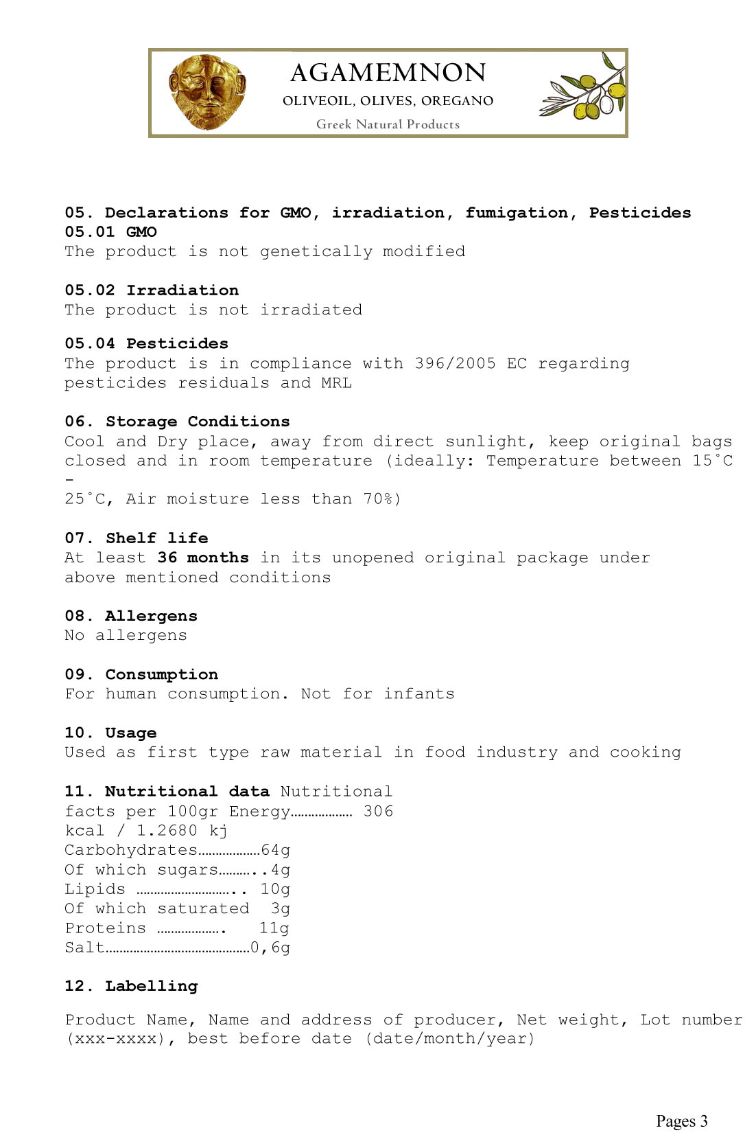 2. Chemical parameters Ash content 16% MAX Acid insoluble ash 3% MAX Moisture 12% MAX Aflatoxin B1 <1 μg/kg Aflatoxin total <1 μg/kg Metals Lead ≤0.3mg/Kg Arsenic ≤0.1mg/Kg Cadmium ≤0.2mg/Kg
